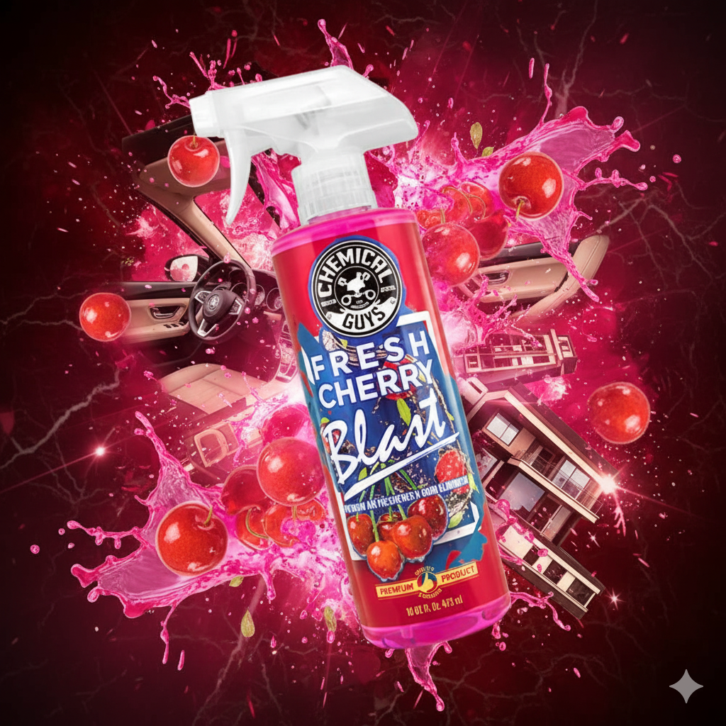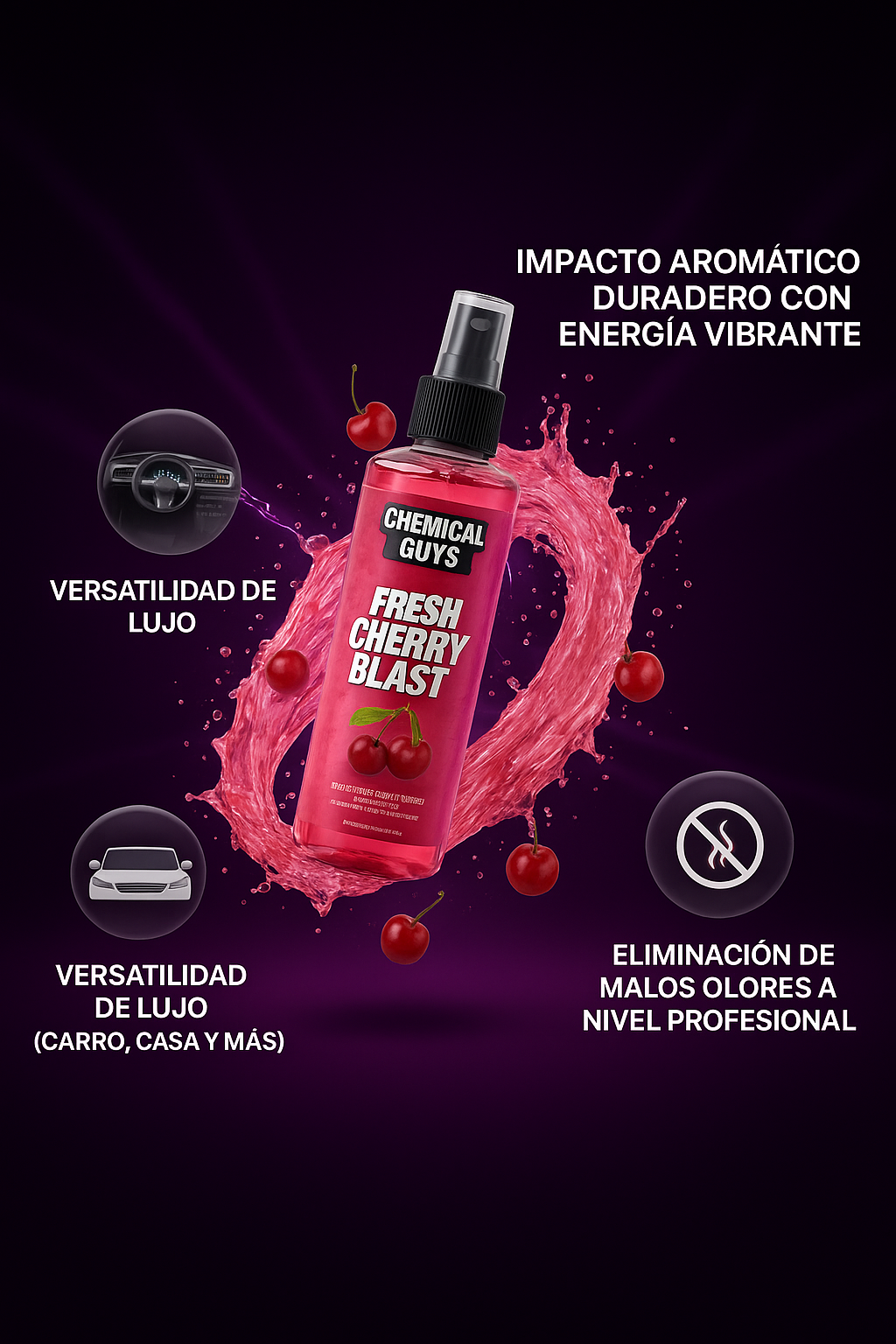 Siente la descarga de frescura que lo transforma todo. Con Chemical Guys Fresh Cherry Blast, no solo eliminas los malos olores, sino que infundes cada espacio con la vibrante esencia de cerezas recién cortadas.